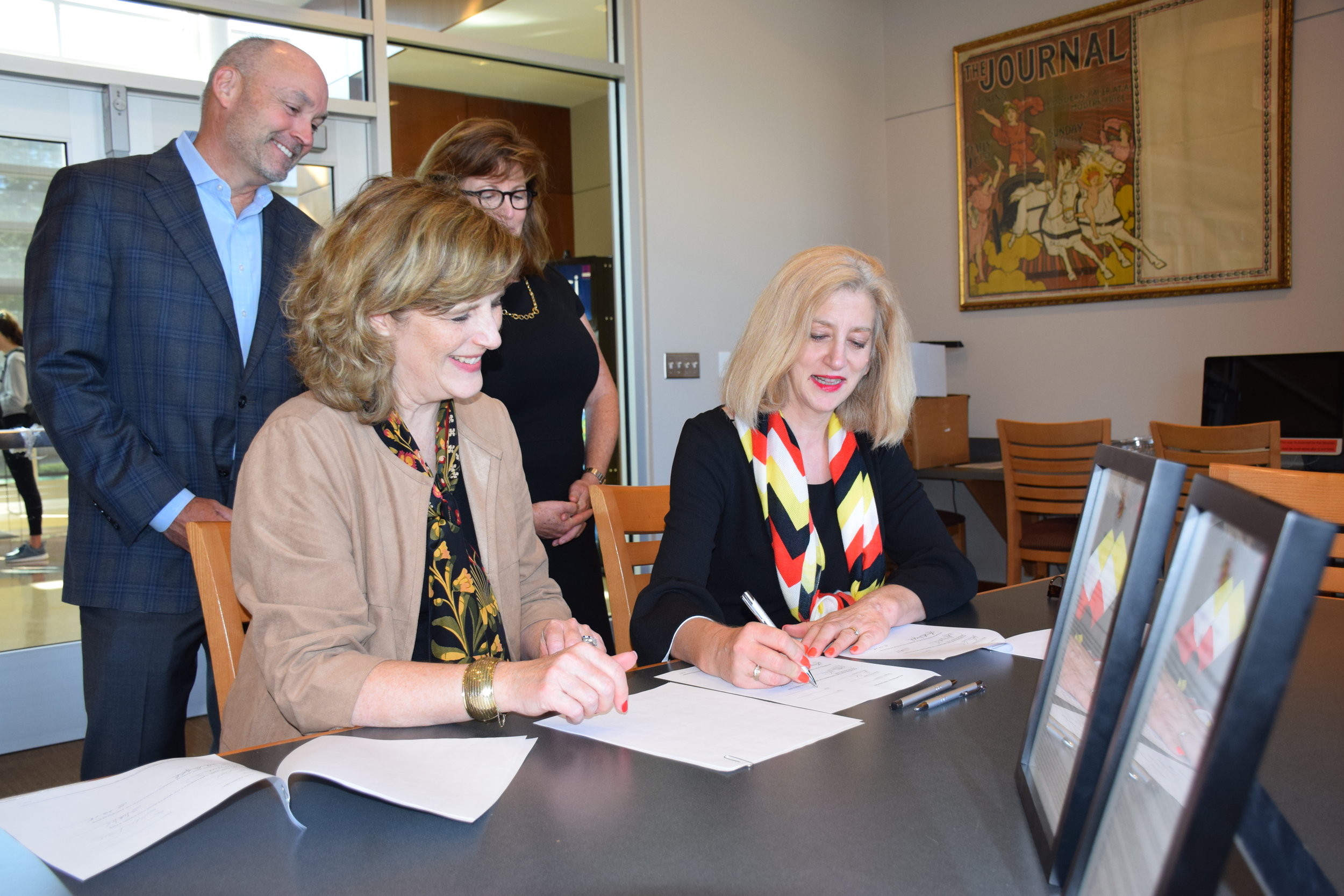 Lucy A. Dalglish (left), dean of the University of Maryland Philip Merrill College of Journalism, and Andrea Chamblee (’83) sign an agreement in the Gaylord Library of John S. and James L. Knight Hall to establish a scholarship in honor of John McNamara (’83) as friends watch in the background. (Photo courtesy of Alexander Pyles)