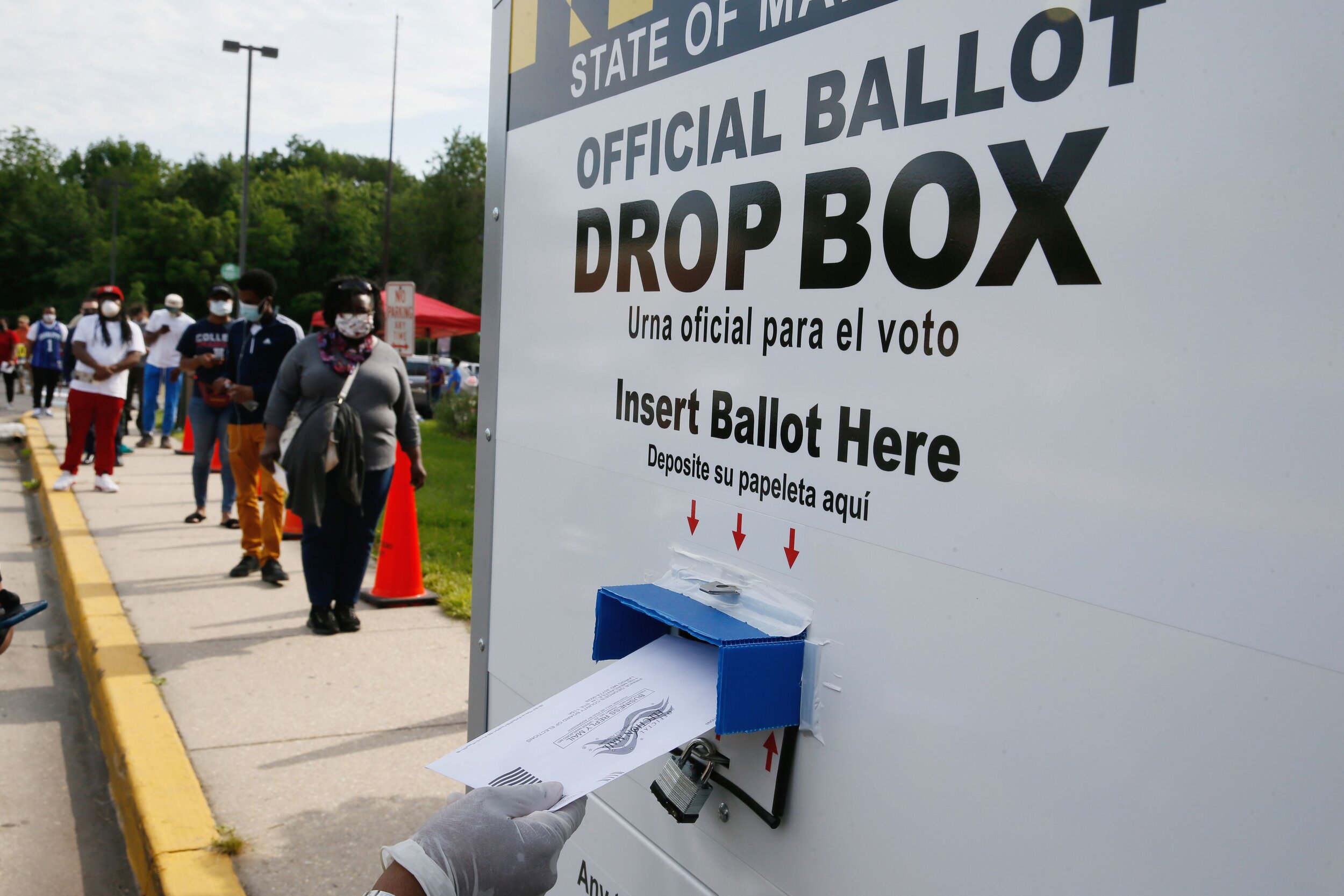 Voters in College Park, Maryland line up in front of a ballot box to cast their votes in the primary election. (Jim Bourg/Reuters)