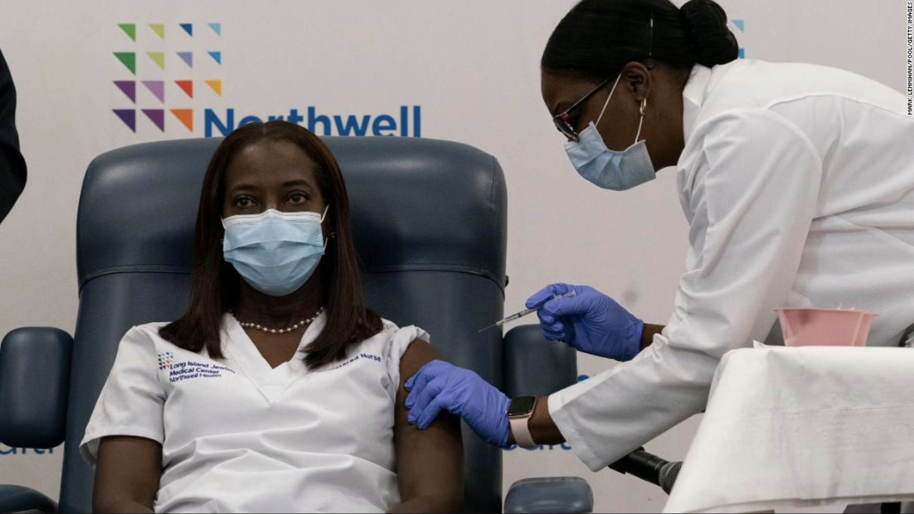 Dr. Michelle Chester, right, injects nurse at Long Island Jewish Medical Center, Sandra Lindsay, with COVID-19 vaccine. (Source: CNN)