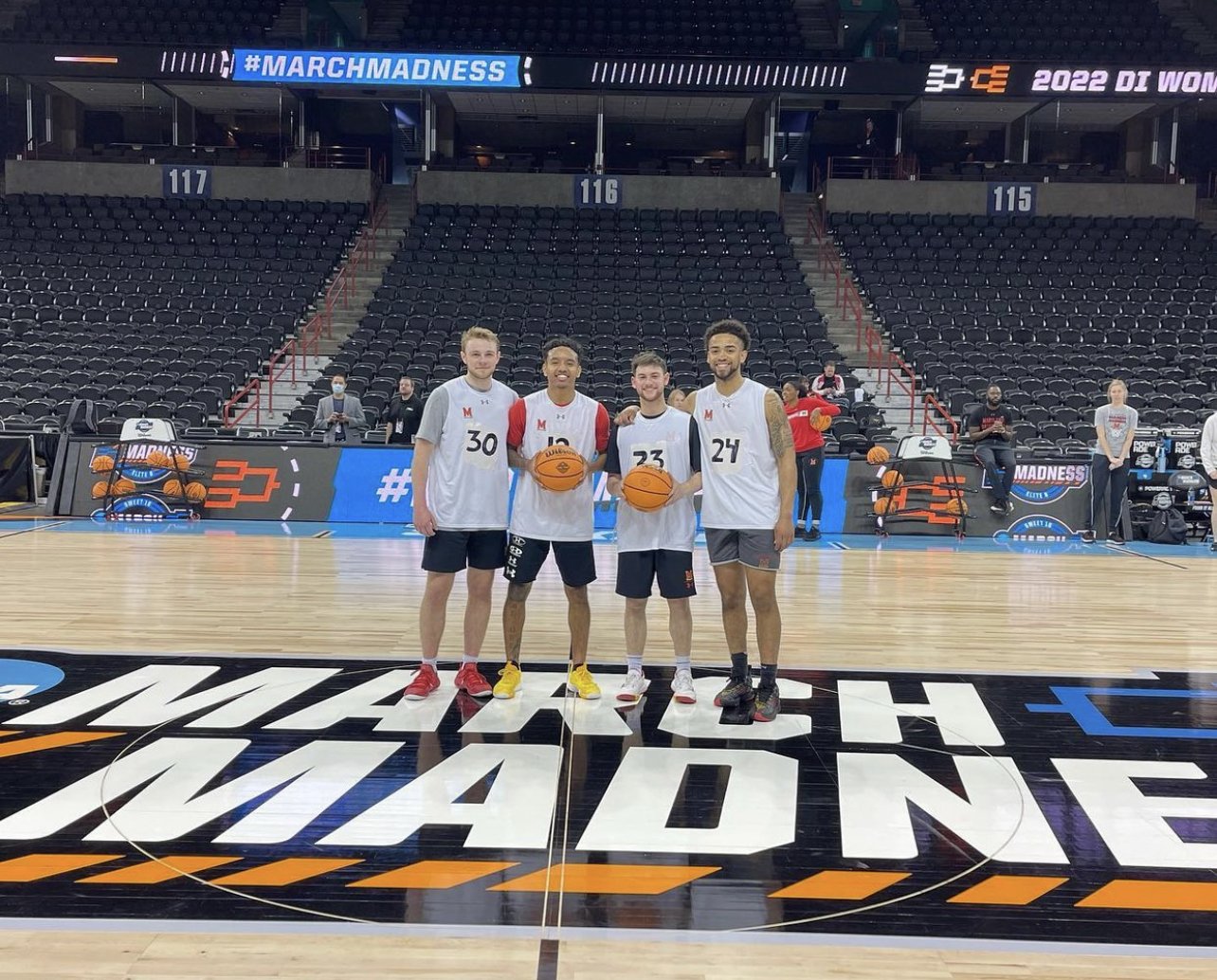 The Maryland Women’s Basketball Scout Team prepares for the Sweet 16 of the NCAA March Madness Tournament in Spokane, Washington. (From Left to Right: Mason Green, Quincy Cunningham, Jacob Krause, and Jaden Blocker) (Maryland WBB Scout Team/Instagram @umdwbb_scout)
