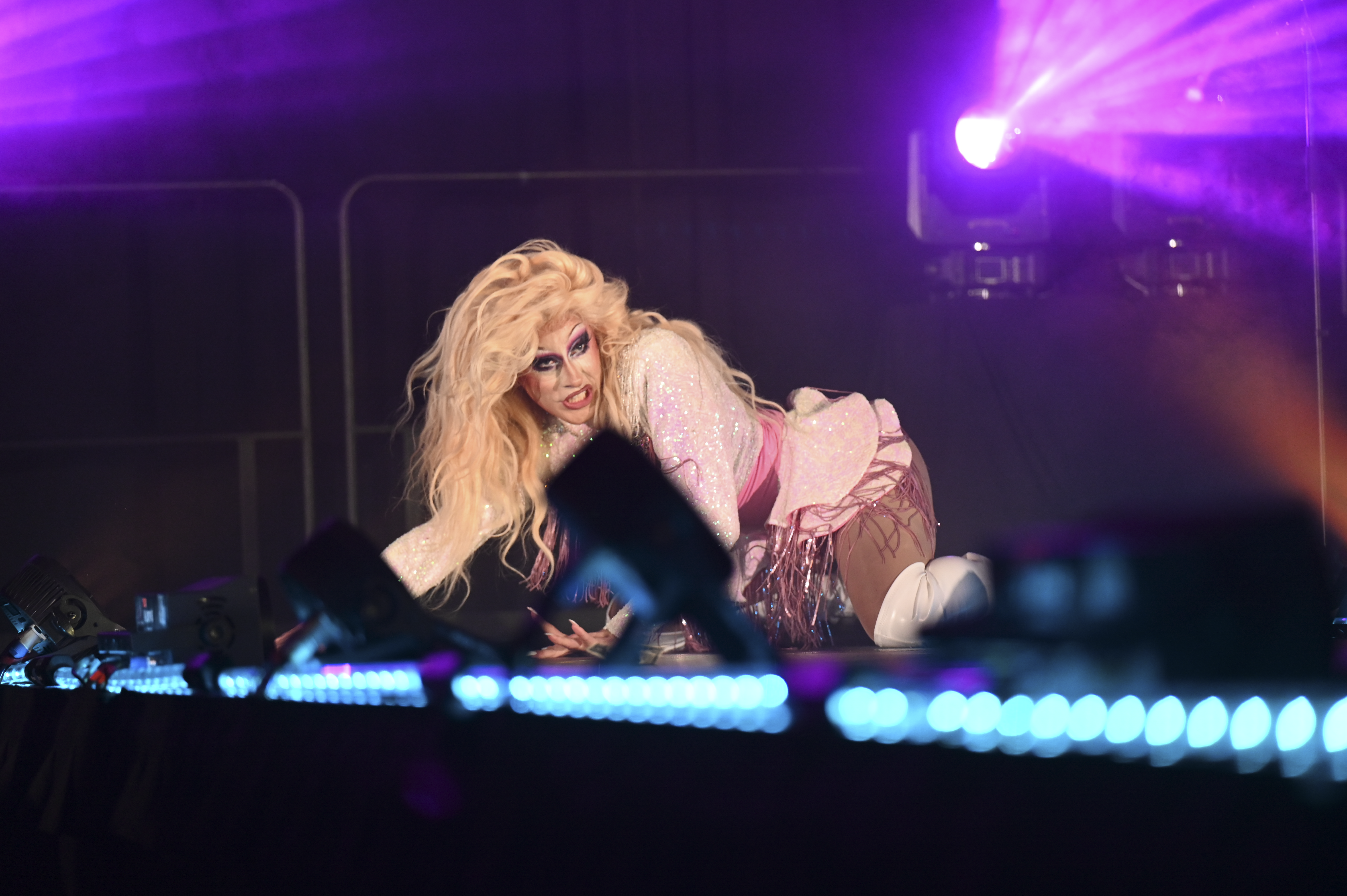 Local performer Venus Valhalla performs a split on stage at the SEE Spring Drag Show at Stamp Student Union on April 17, 2026. (Jessica Wu/The Black Explosion)
