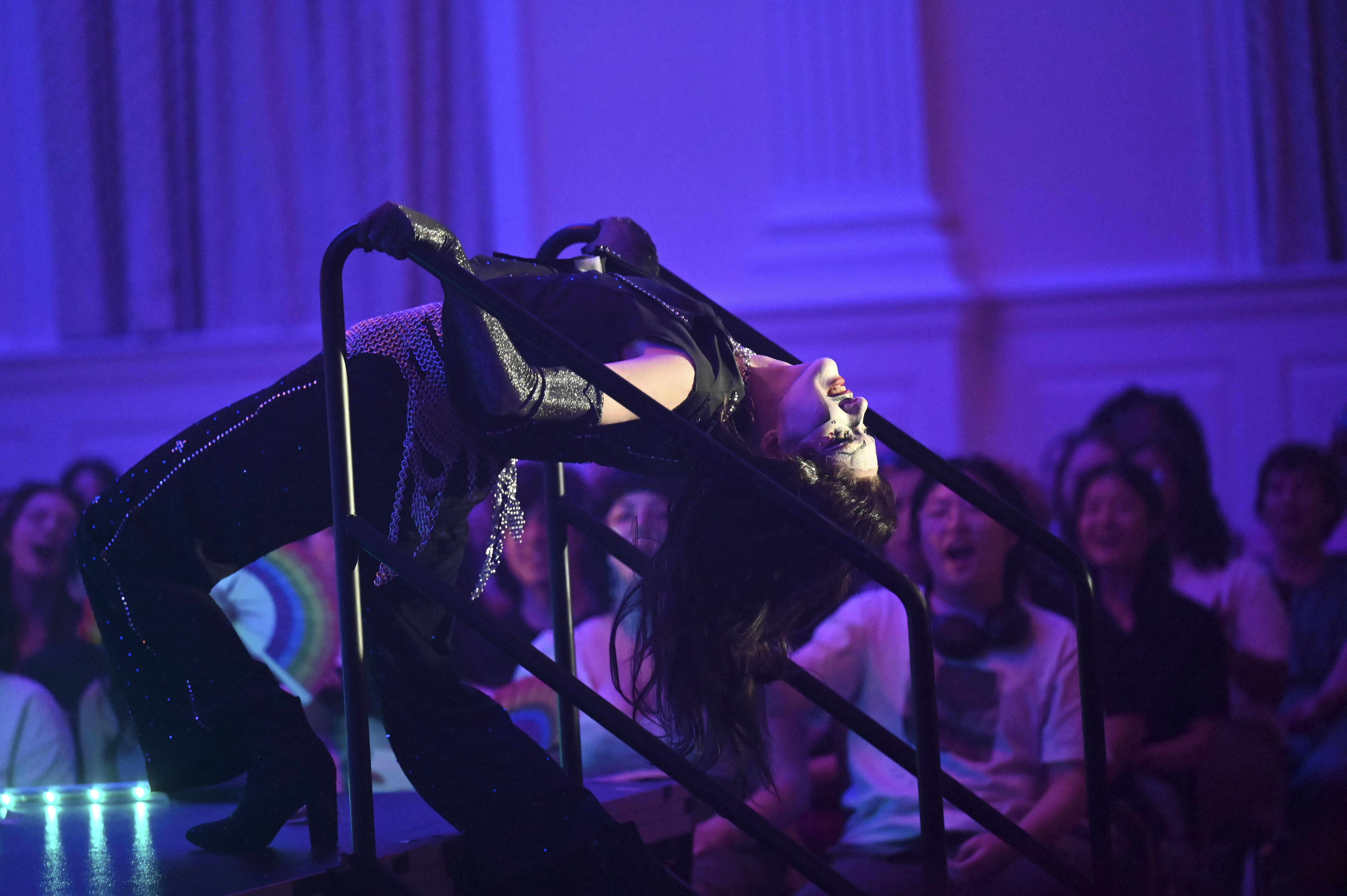 Student performer Sinistaire bends over backwards to put on a show at the SEE Spring Drag Show on April 17th, 2026. (Jessica Wu/The Black Explosion)