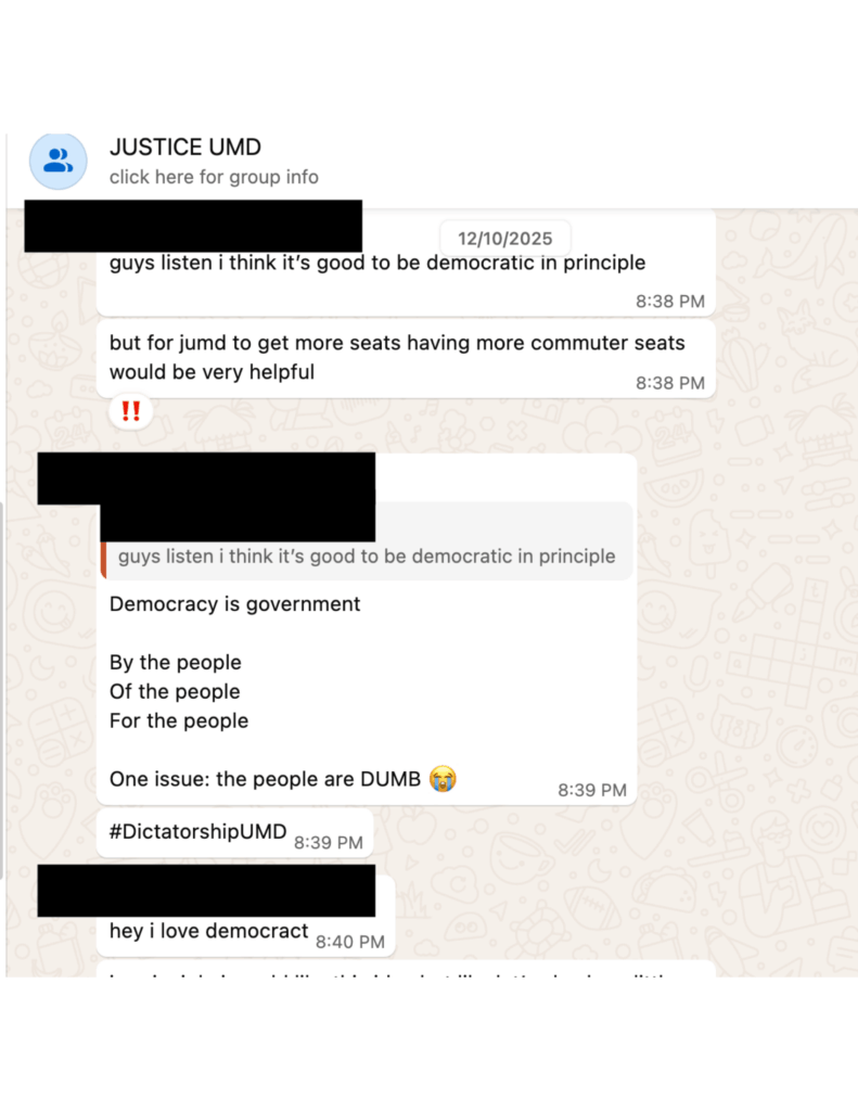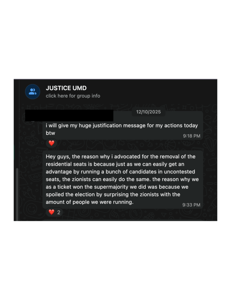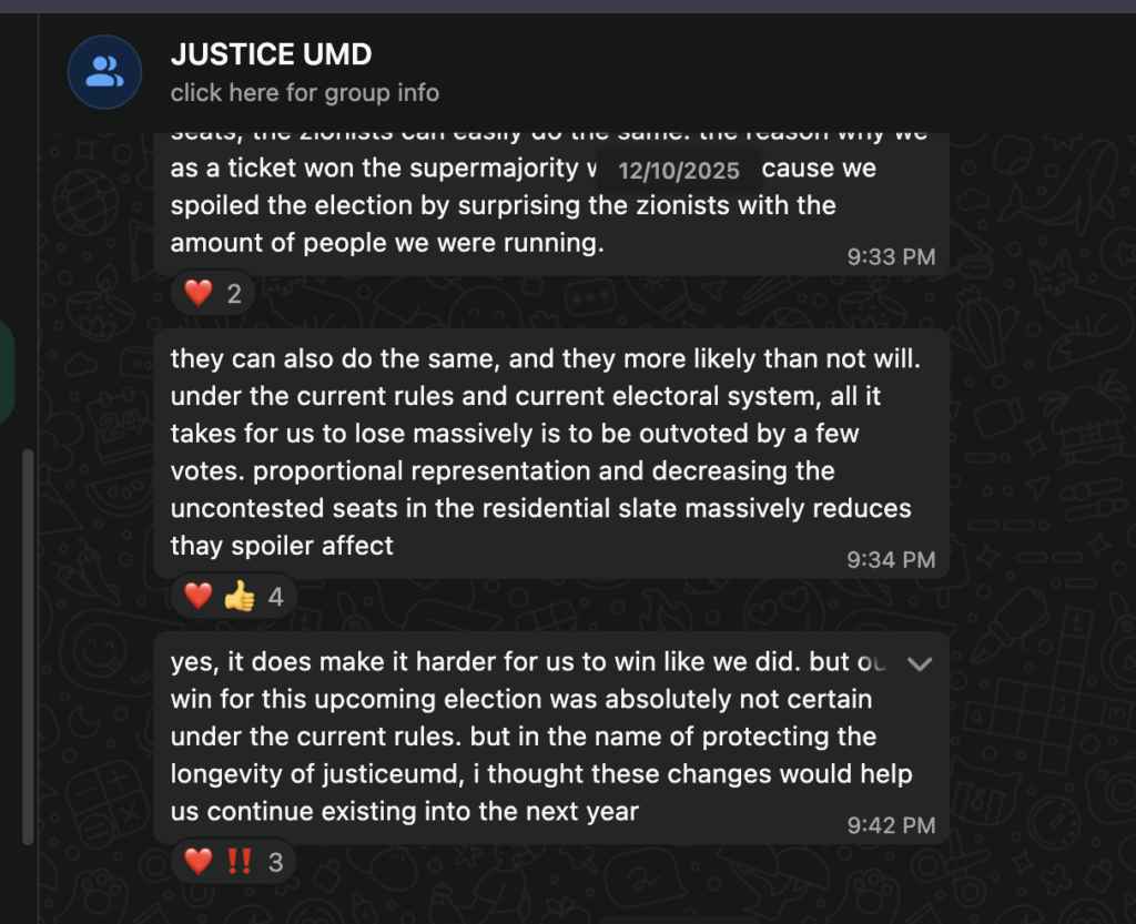 The text messages appear to argue that the 2025 ticket won a majority in the legislature because of the amount of positions it could fill in the election. The sender believed that voting to reduce the number of seats would protect JusticeUMD from “zionist” challengers in 2026.